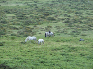 Und dann gibt es noch die wilden Pferde. In allen Farben, eher klein.Manchmal sind noch kleine Fohlen bei den Stuten. Noch sind die Herden gemischt, aber es wird versucht, die Moor Ponys wieder anzusiedeln, die ursprünglich hier zu Hause waren.