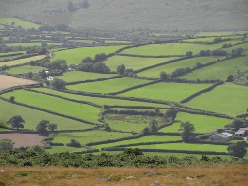 Die Wiesen sind teils durh lange, niedrige Steinmauern unterteilt. Einzelne windflüchtende Bäume stehn rum. Die Landschaft hat eine braungrüne Farbe, unterbrochen von grünem Farn, gelben Blüten, violettem Heidekraut.