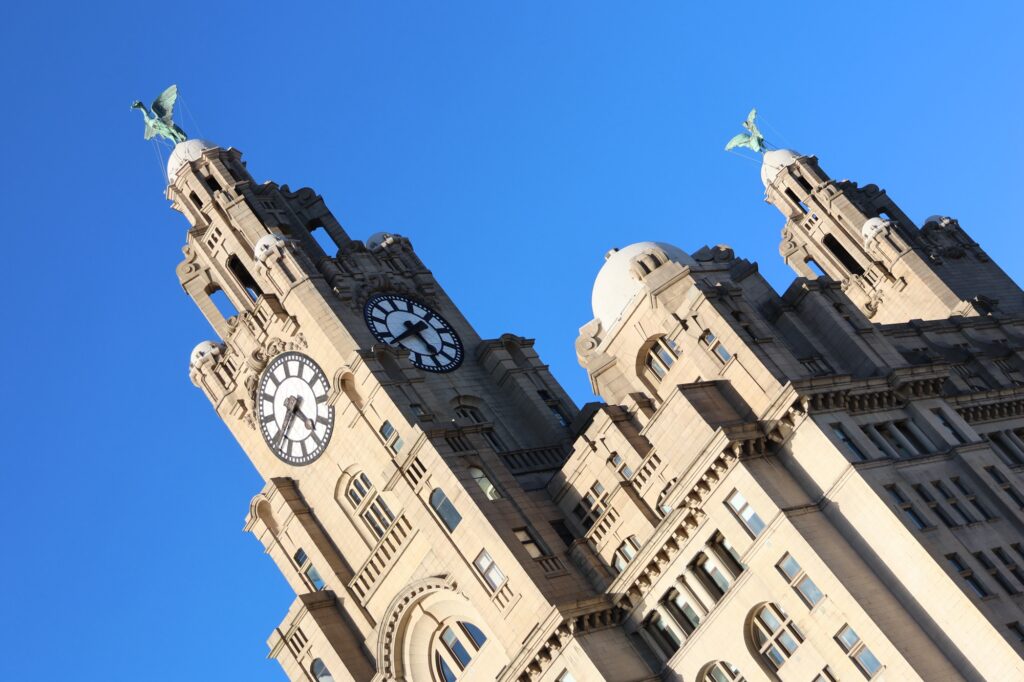 Aus dem Tunnel unter dem River Mercy landet man direkt im Zentrum von Liverpool mit einem ersten Blick auf die Türme mit den Liverbirds.
