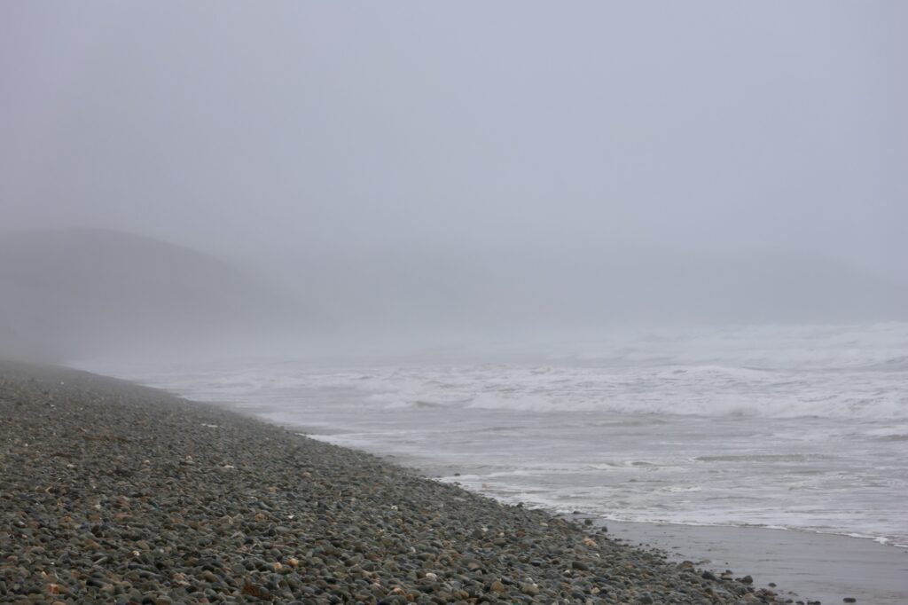 Auf dem Heimweg nach Little Haven haben wir noch an einem besonderen Strand halt gemacht. Bei Flut geht das Meer bis an einen langen Wall aus Pebbles – Steinen. Mit dem Dunst, den hohen Wellen und dem Geräusch der bewegten Steine – eine fast mystische Stimmung.